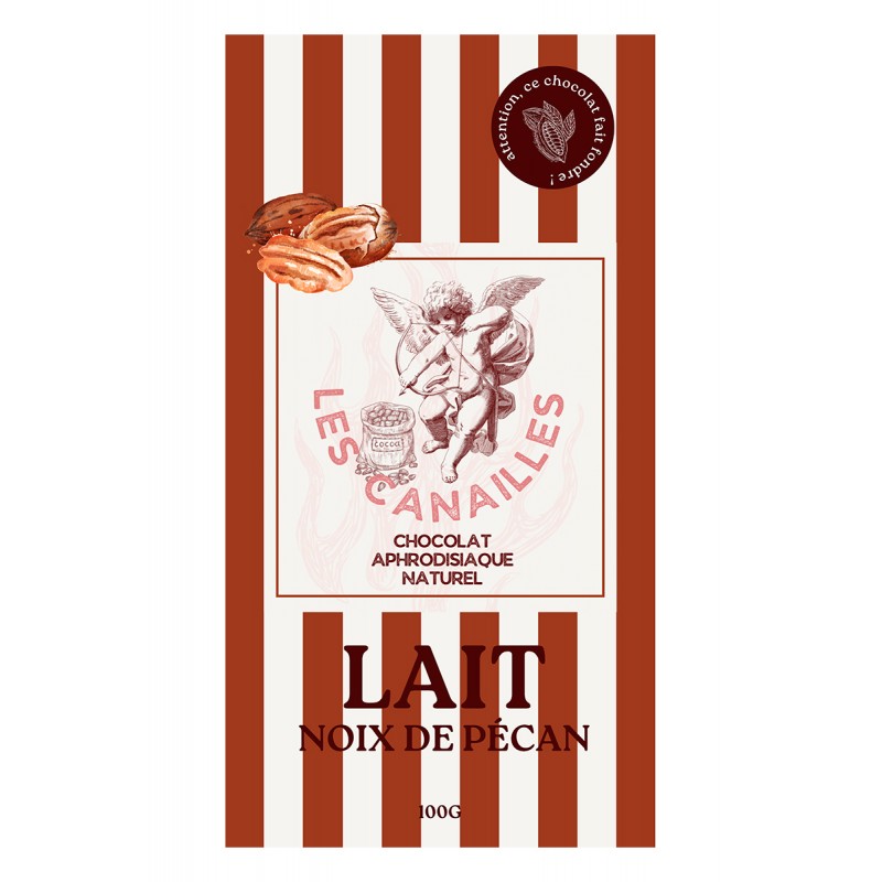 La marque française Les canailles présente son chocolat aphrodisiaque naturel au lait et noix de pécan en tablette de 100g.