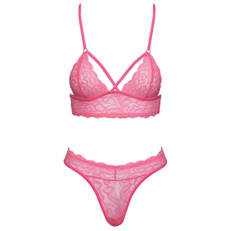 Ensemble de lingerie de Cottelli FANTASY avec soutien-gorge doux et string. Entièrement en dentelle rose fluo. Doux et élastique sur tout le pourtour. Soutien-gorge dos nu avec lanières élastiques sur les bonnets doux. Empiècement en dentelle dans le dos libre et entrejambe réglable.