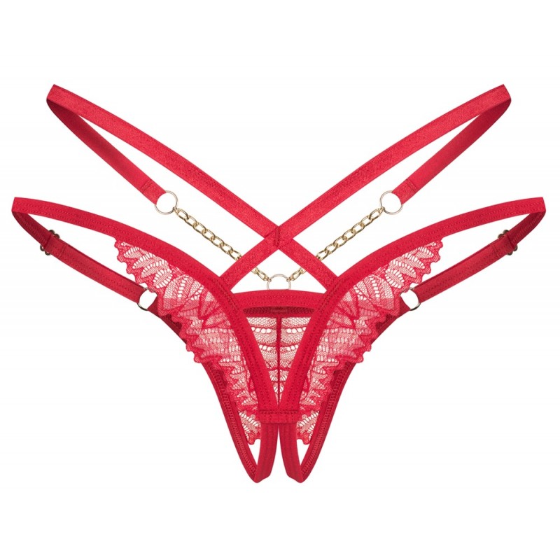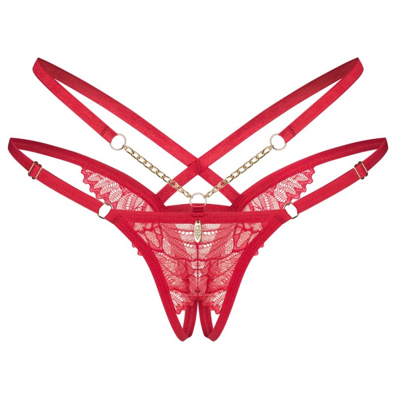 Riostring ouvert Matildea de Obsessive dans un style élégant à lanières. Dans un rouge profond avec une fine dentelle et des détails dorés. Doux et élastique pour un grand confort. 2 petites chaînes et un petit élément décoratif ornent l'avant. La ceinture inférieure du string est réglable. Ouverture séduisante à l'entrejambe.